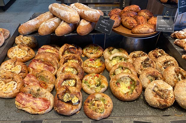 店内は個性豊かなパンがたくさん販売されています。こちらはピザ系パンですが種類も多め。